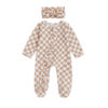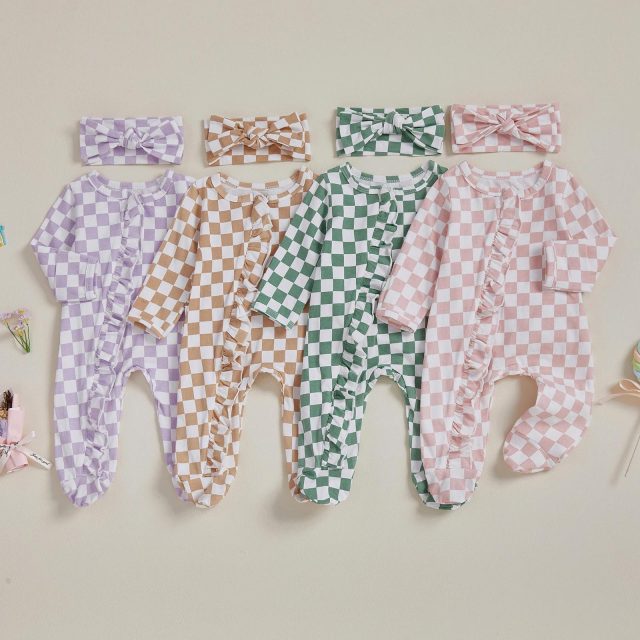 Dress your baby girl in cozy, picture-perfect style with this charming 2-piece fall footies bodysuit and headband set. Designed for newborns and infants up to 3 months, this romper combines warmth, softness, and irresistible cuteness. The trendy checkerboard pattern and delicate ruffle trim add a touch of playful fashion, while the easy zip-front closure makes dressing and diaper changes quick and stress-free.