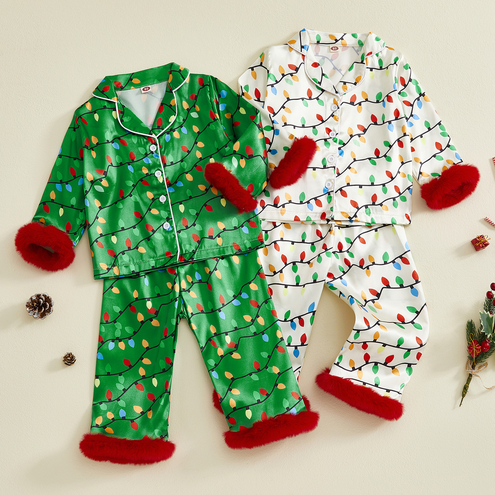 Wrap your little one in holiday cheer with this silky-smooth satin pajamas set designed for cozy nights and joyful mornings. Featuring a charming light string Christmas print, this two-piece set includes a long sleeve button-down top with a classic lapel collar and matching full-length pants. The soft sheen of the satin fabric gives it a special festive look, while staying gentle and comfortable for everyday wear.