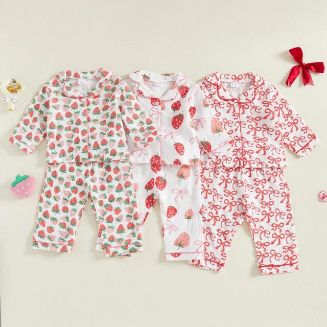 Wrap your little one in comfort and charm with this adorable Pajama Set for toddler girls. Designed for cozy nights and playful mornings, this two-piece sleepwear set features a button-up long sleeve top with a sweet lapel collar and a matching pair of soft pants. The delightful bow and strawberry prints bring a playful touch that your child will absolutely love. Whether it’s bedtime, lounging at home, or snuggling during storytime, this pajama set keeps your girl warm, comfy, and irresistibly cute.