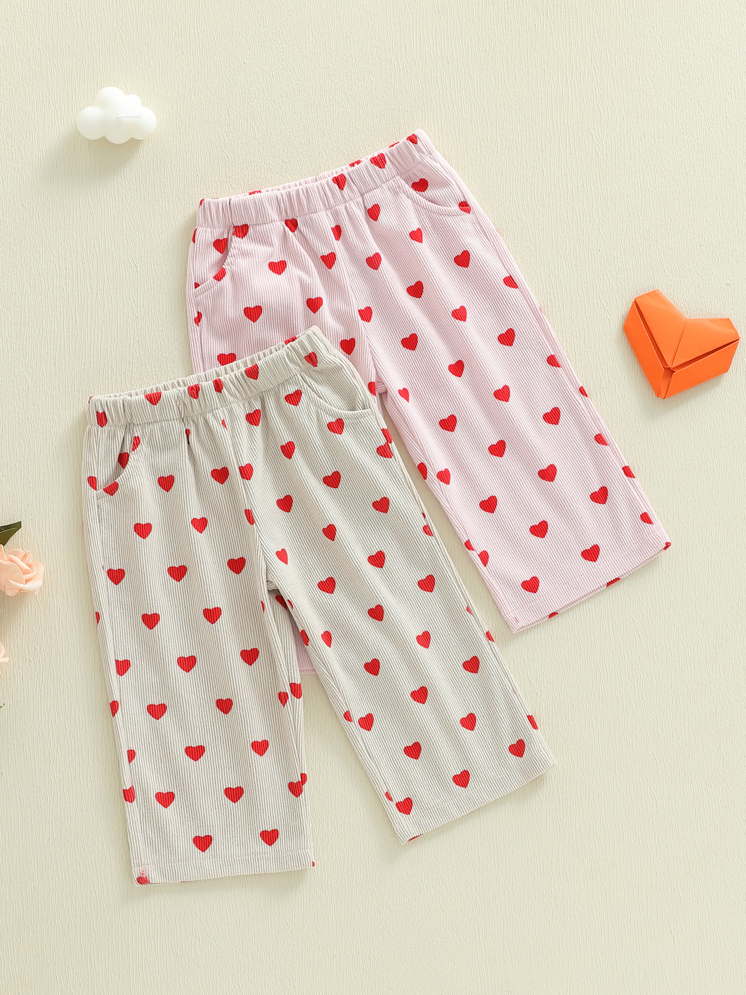 Dress your little girl in adorable comfort with these charming Valentine heart print pants. Designed to feel as good as they look, these wide leg corduroy pants bring a cozy texture and playful heart pattern together in one irresistible piece. The soft fabric feels gentle on delicate skin, while the relaxed shape gives your toddler plenty of room to move, play, and explore with confidence. Perfect for everyday wear with a festive touch, these pants instantly add sweetness to any outfit.
