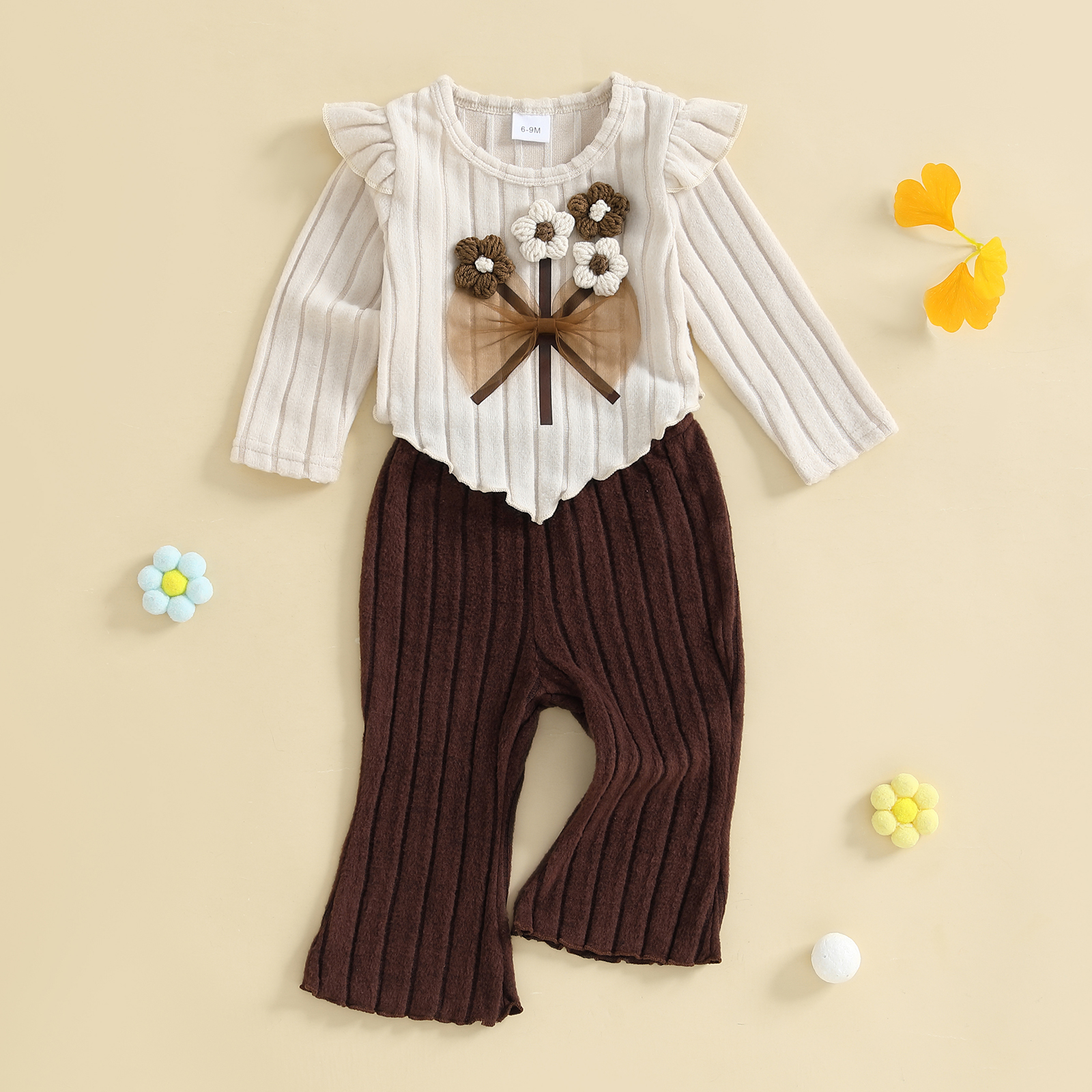 • 2-piece outfit set: Includes a crochet flower pullover and ribbed flare pants