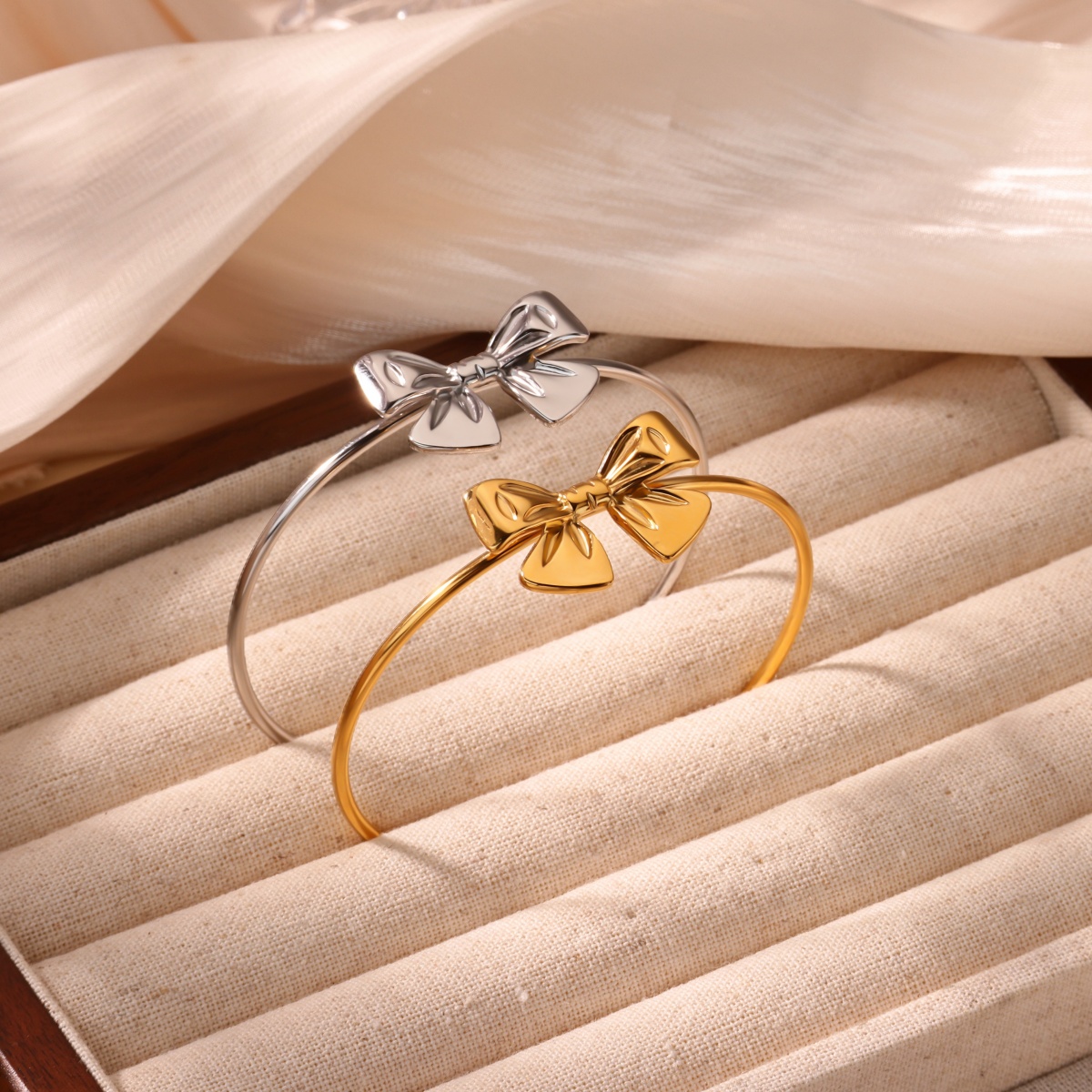 Elevate your look with the Gold Bow Tie Open Cuff Bracelet, a perfect blend of sophistication and trend. Crafted with precision from high-quality stainless steel and finished in a radiant gold tone, this bangle is designed to make every outfit shine. The delicate bow tie design adds a touch of femininity and charm, making it ideal for women and girls who love refined, minimalist jewelry with a playful twist.
