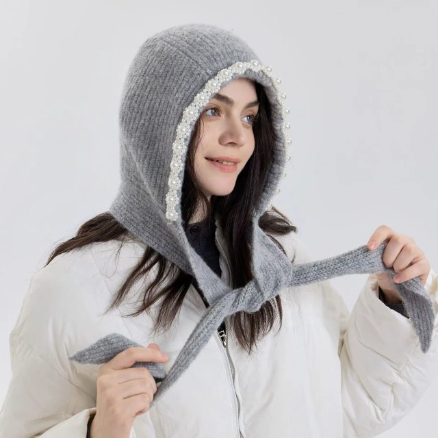 What truly makes this hat stand out is its blend of function and fashion. Unlike basic beanies, this design comes with an attached hood and ear flaps that help block cold air around your neck and ears. The beautiful pearl detailing adds a soft, feminine touch, inspired by Korean street fashion, making it more than just a winter accessory—it’s a style statement.