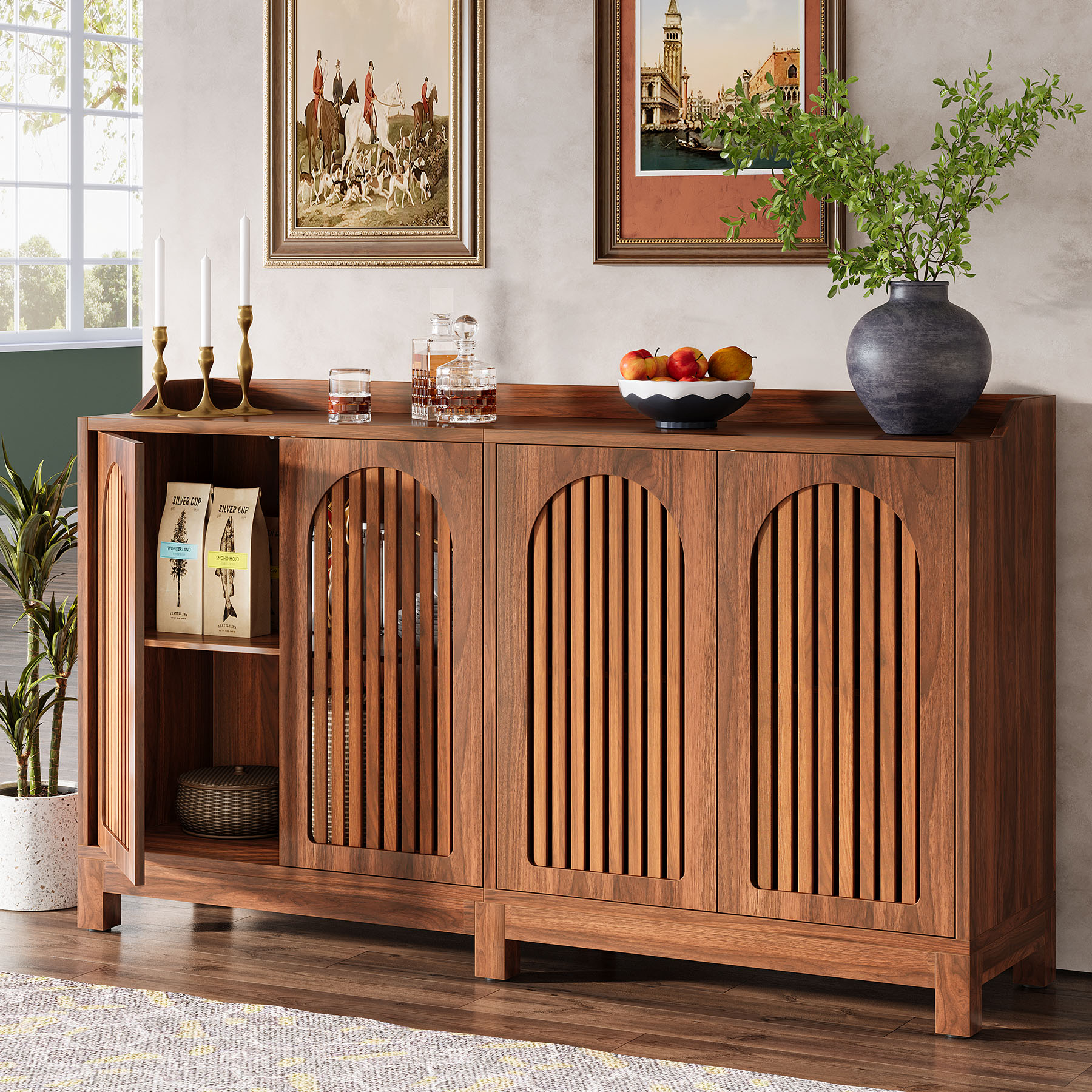 Ideal for your dining room, kitchen, living room, or entertainment area, this buffet cabinet blends style, function, and durability. Upgrade your home organization and elevate your decor with this stunning walnut farmhouse sideboard. Bring home this beautiful piece today and enjoy a perfect combination of elegance and practicality.