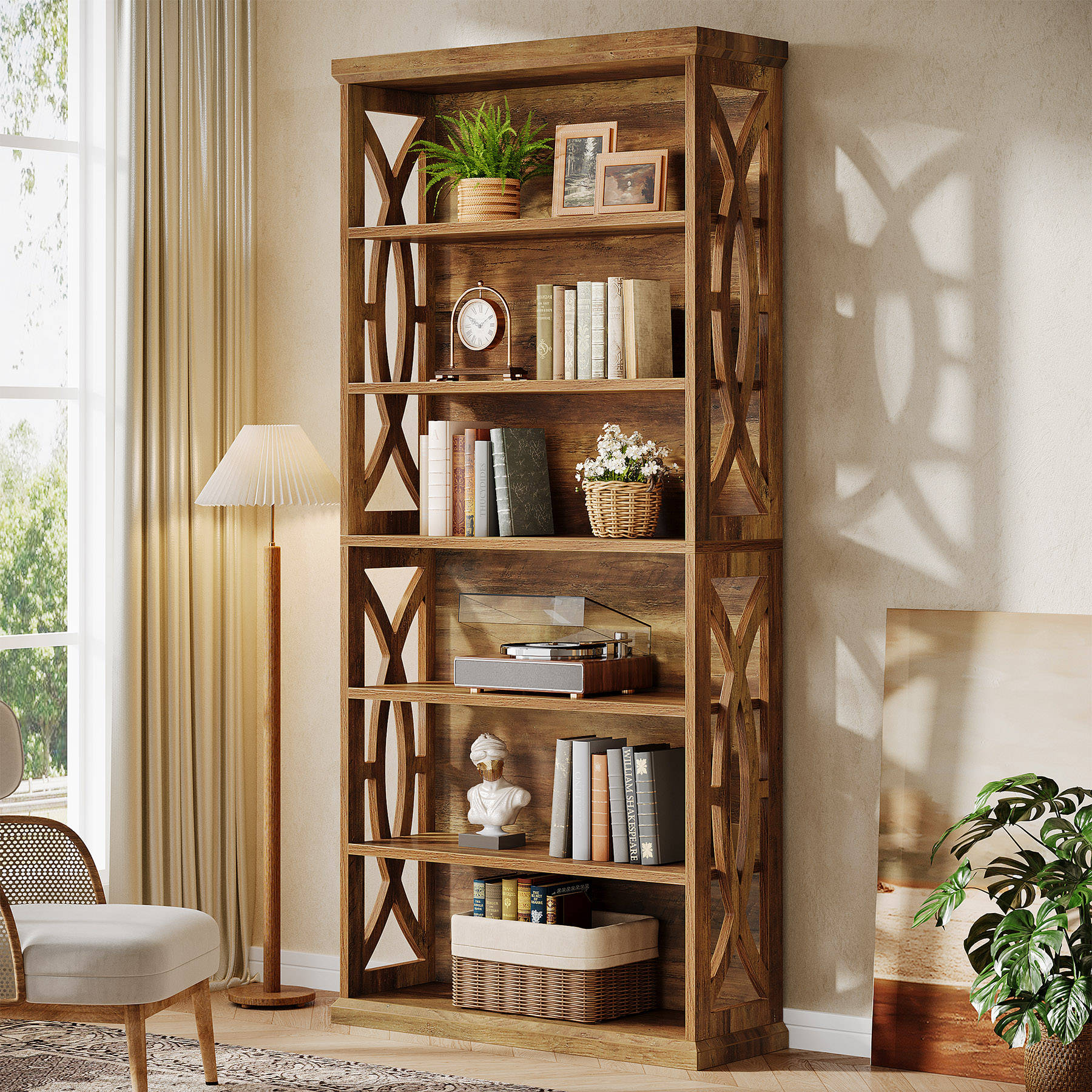 Transform your living space with this beautifully designed 6-tier freestanding bookcase. Standing at 71 inches tall, this large industrial-style bookshelf not only offers ample storage but also elevates the aesthetic of any room. The sleek, eye-catching patterns on both sides of the bookshelf bring a touch of sophistication to your home or office, creating a warm and welcoming atmosphere. Perfect for any contemporary or country-inspired interior, this bookshelf combines style with practicality, making it a must-have for any room.