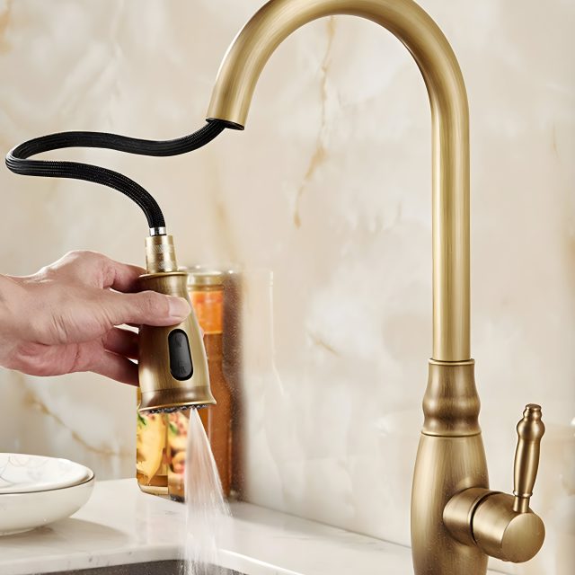 Ideal for both classic and contemporary kitchens, this faucet stands out for its versatility and timeless beauty. Whether you’re cooking, cleaning, or filling large pots, its practical design and smooth performance make every kitchen task effortless. The retractable spout and rotatable base ensure convenience, while the antique brass finish adds a warm, vintage touch that complements any décor.