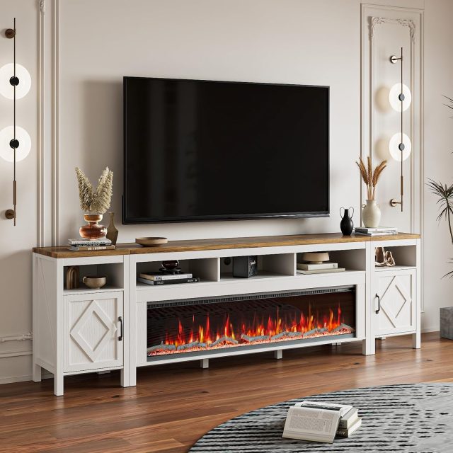 Bring charm, comfort, and style into your living space with this Farmhouse TV Stand with 60″ Electric Fireplace. Designed for modern living with a rustic touch, this entertainment center transforms any room into a cozy retreat. With its white cabinet body, oak-colored top board, and elegant farmhouse design, it perfectly balances sophistication and warmth. Sized at 97.5″L x 15.55″D x 29″H, this stand easily supports flat-screen TVs up to 110 inches, making it the ideal centerpiece for large living rooms or family spaces.