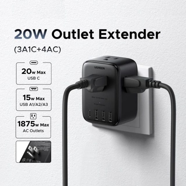 UGREEN Outlet Extender 20W Power Strip 4 AC Outlets 3 USB-A 1 USB-C Wall Charger for Home Office Travel 1875W 15A 125V
