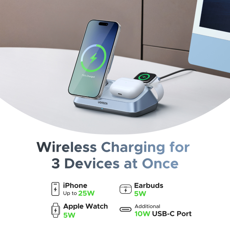 This 3-in-1 Magnetic Wireless Charger Stand isn’t just about function – it’s about convenience, style, and peace of mind. Whether you’re at home, at work, or traveling, this charger keeps your devices powered up without the mess of tangled wires. The fast-charging capability of 25W Max means you can get back to using your devices in no time, perfect for when you’re on the go. The built-in magnetic alignment also ensures your devices are securely attached, so you don’t have to worry about them slipping off mid-charge.