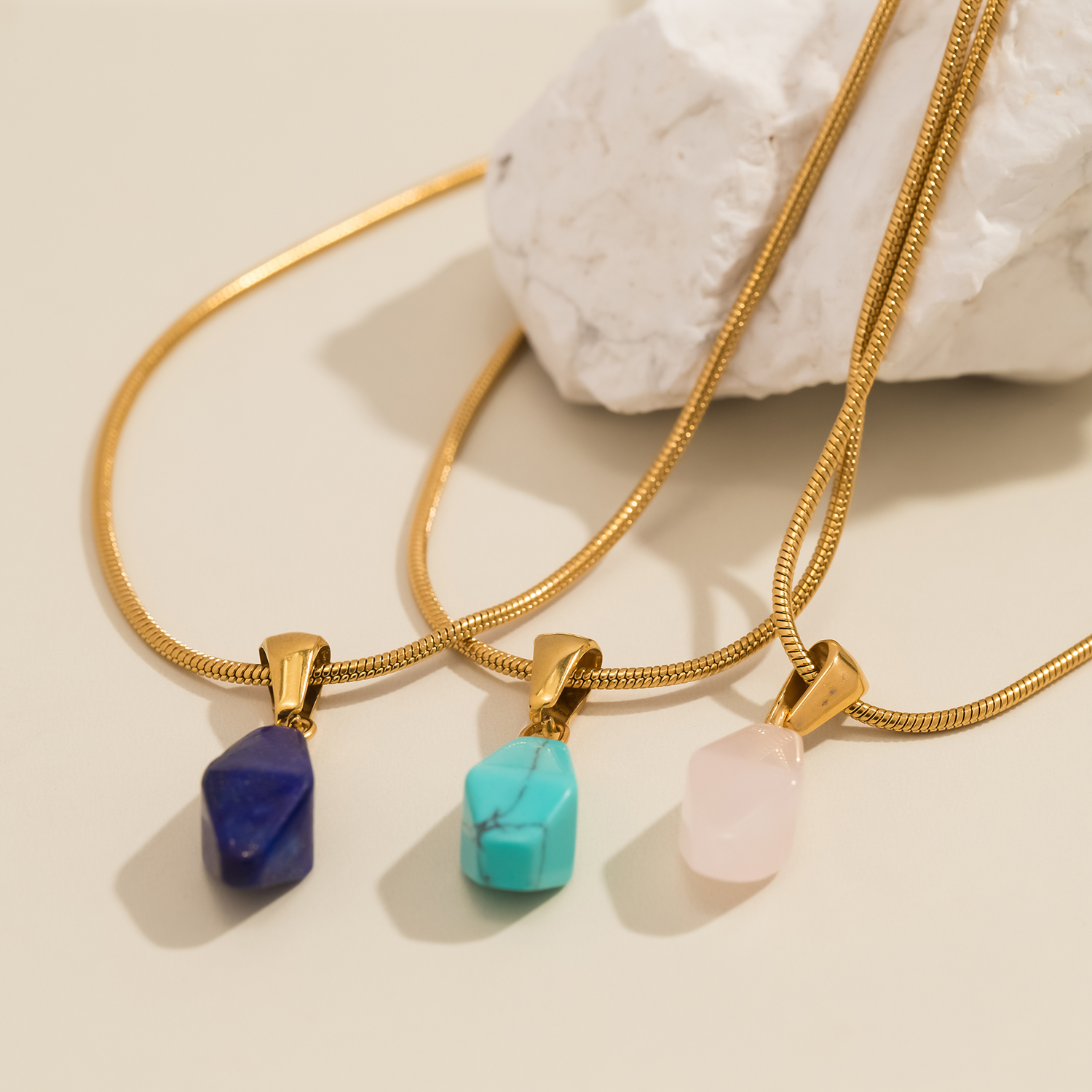 This geometric natural stone pendant necklace is designed for women who love simple beauty with a modern edge. Clean lines, a soft natural stone look, and a smooth round snake chain come together to create a piece that feels elegant, feminine, and easy to wear. It adds just the right amount of shine without ever feeling overdone, making it a go-to accessory for both everyday moments and special occasions.