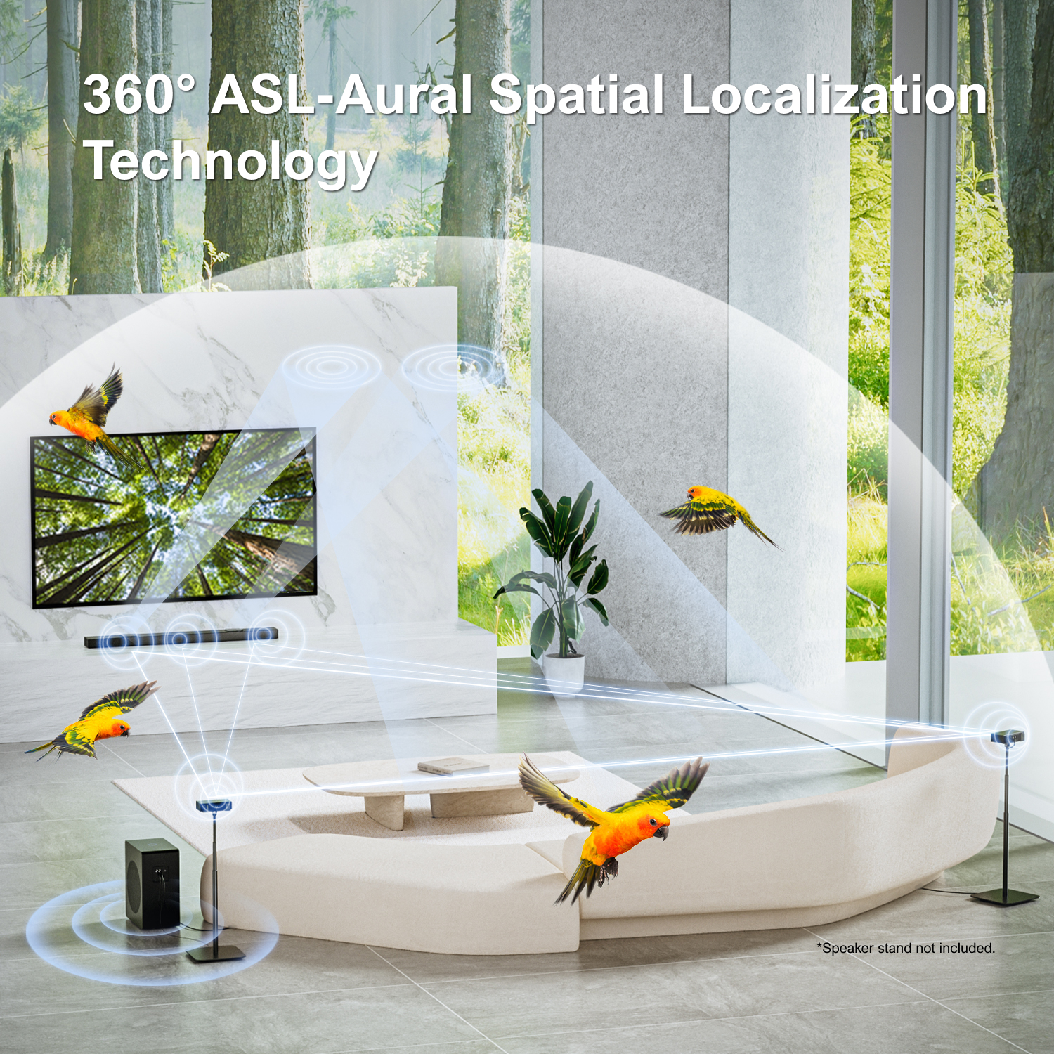 The revolutionary feature is its true 5.1.2 channel configuration with up-firing drivers for overhead sound. While most soundbars only project audio forward, this system features two up-firing speakers that direct sound upward to bounce off your ceiling, creating genuine height effects that make you feel like sound is coming from above. Combined with 360° Aural Spatial Localization Technology that precisely positions every sound element in three-dimensional space, this system delivers the most immersive audio experience available for home entertainment.