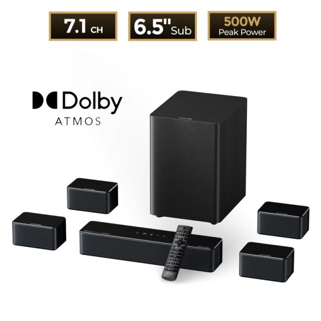 The revolutionary feature of this system is its complete 7.1 channel surround sound with four wired speakers that create genuine 360° audio. Unlike soundbars that simulate surround sound, this system includes two front and two rear speakers that physically place sound all around your room. Combined with Dolby Atmos technology and advanced 3D positioning algorithms, it precisely places every audio element in three-dimensional space. You’ll hear helicopters flying overhead, rain falling around you, and conversations happening beside you—exactly as the creators intended.