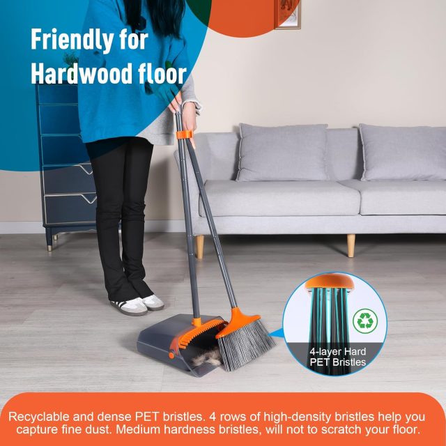 Featuring an extendable pole design, the broom handle adjusts from 38.18 to 50.39 inches, letting you sweep comfortably without bending over. The four-row heavy-duty bristles are dense and durable, capturing even the finest dust and pet hair with ease. A self-cleaning dustpan with built-in teeth lets you comb out hair and debris in one swift motion—keeping the bristles clean and ready for more. Plus, the rubber lip of the dustpan sits flush against the floor, ensuring no dirt gets left behind.