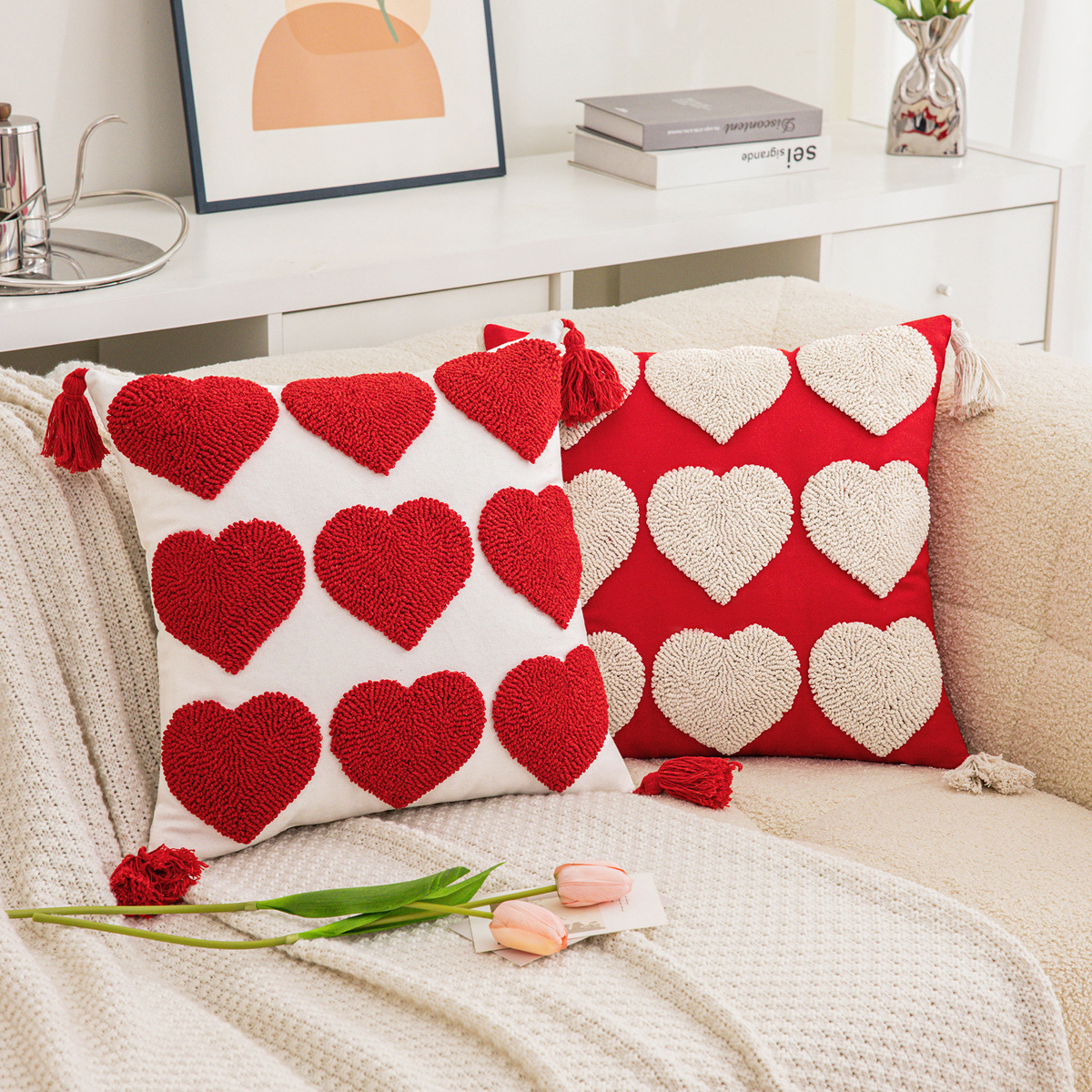 This piece stands out thanks to its delicate embroidered heart pattern paired with handcrafted tufted tassels. The design is not printed, which means the details feel textured, refined, and premium. It brings a festive Valentine’s Day vibe while remaining versatile enough for year-round use. Simple care and long-lasting fabric make it as practical as it is beautiful.