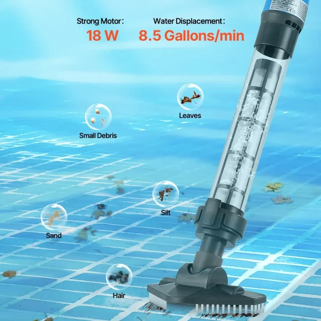 Enjoy crystal-clear water with this cordless pool vacuum designed to make pool care effortless. Featuring a high-performance 18W motor and an impressive 8.5 gallons per minute drainage flow rate, it quickly removes dirt, sand, leaves, and debris from the pool bottom, leaving your water fresh and inviting. No messy cords, no heavy equipment—just pure cleaning power at your fingertips.