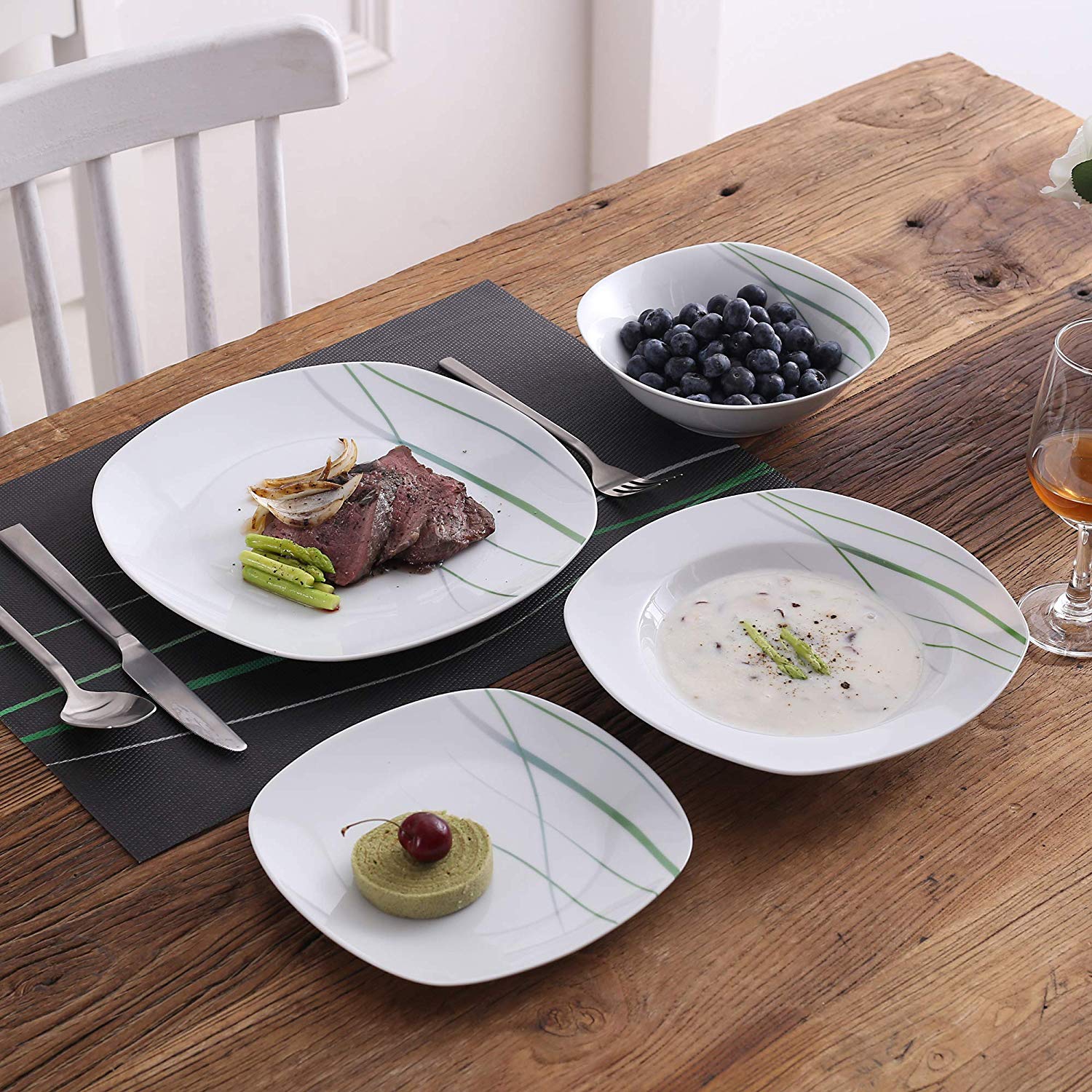 • Includes dinner plates, dessert plates, soup plates, and bowls