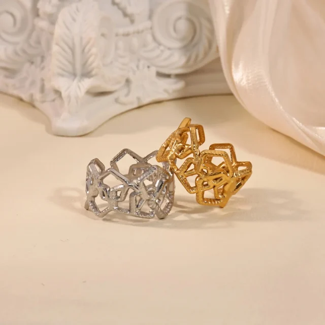 This striking geometric ring features an intricate pentagon pattern that symbolizes strength and unity, with a unique hollow design that adds a light and airy feel to its bold structure. Whether you’re attending a wedding, an engagement party, or simply looking to stand out at a casual gathering, this ring is the ideal accessory to complement your personal style.