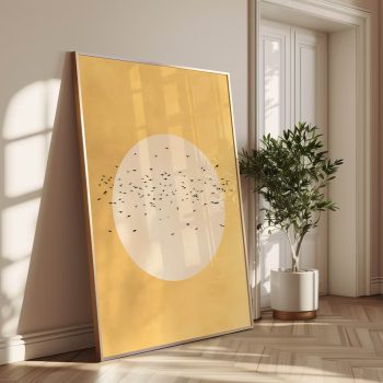 Yellow Sun & Flying Birds Abstract Wall Art Print – Japanese-Inspired Living Room Decor