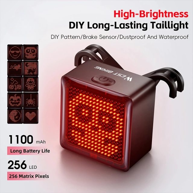 Featuring a powerful 1100mAh battery and ultra-bright 256-pixel LED matrix, this rear light displays vivid, animated patterns while delivering intelligent brake-sensing technology. The 16×16 LED grid allows for dynamic visuals, including hearts, emoticons, skeletons, animals, and more. Built for creative riders, it’s the perfect blend of fun and function.