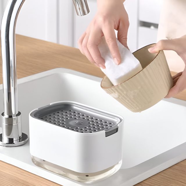 Upgrade your kitchen sink with this modern foam soap dispenser with sponge holder. Simple, efficient, and built to last — it’s the small change that makes a big difference. Add it to your kitchen today and enjoy effortless dishwashing every time!