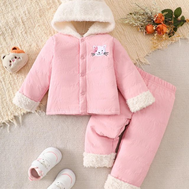 This snowsuit set combines comfort, style, and practicality in one adorable package. The plush fleece fabric provides insulation without adding bulk, allowing freedom of movement for crawling, toddling, or snuggling. The cute cat print brings a playful charm that your little girl will love—and that will earn endless compliments wherever she goes.