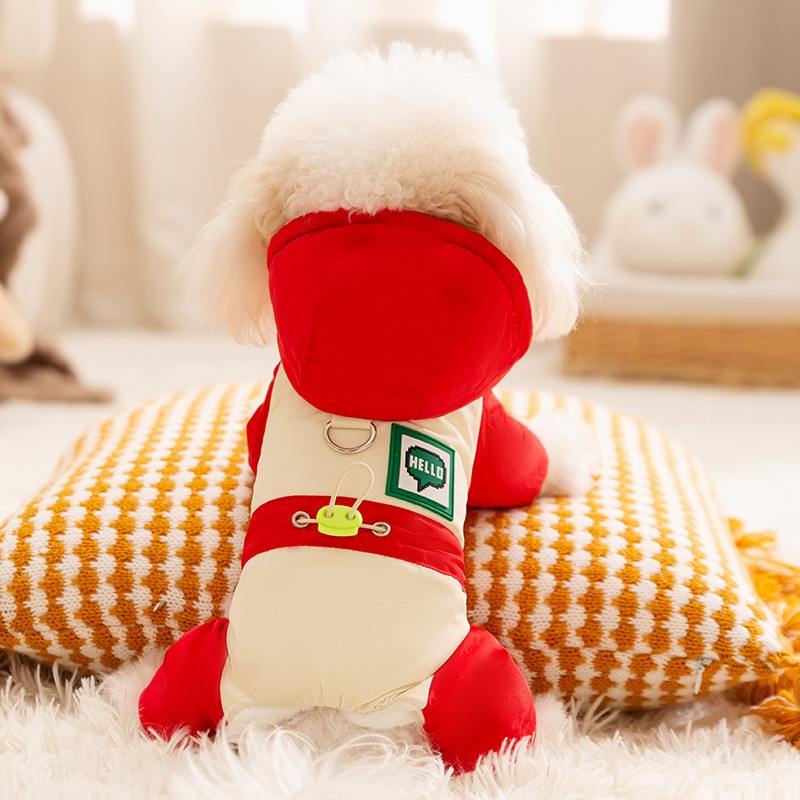 Give your furry friend the ultimate winter comfort with this Warm Cotton Patchwork Dog Hoodie. Designed for small dogs like Teddy, Bichon, and other similar breeds, this thickened four-legged jacket is perfect for chilly days. The soft polyester fiber keeps your pet snug, while the stylish color-block design adds a fashionable touch. With a practical drawstring and waterproof padding, your dog stays warm and dry, making outdoor walks enjoyable even on the coldest days.