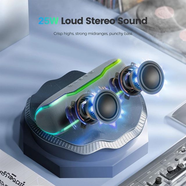 This speaker is built to go wherever you do. Its IPX7 waterproof rating means it’s ready for poolside fun, beach trips, camping nights, BBQs, or rainy hikes without missing a beat. Lightweight and rugged, it slips easily into your backpack and keeps the music flowing for up to 24 hours on a single charge.