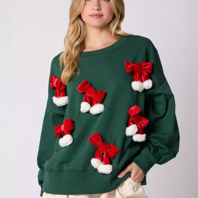 This sweatshirt features a vibrant 3D bow print that instantly adds personality and festive flair. The O-neck design and regular long sleeves give it a timeless silhouette, while the slight stretch ensures easy movement. Crafted using precise tatting techniques, every detail is made to stand out. Whether you’re wrapping gifts, sipping cocoa, or strolling through winter markets, this top brings joy to your seasonal wardrobe.