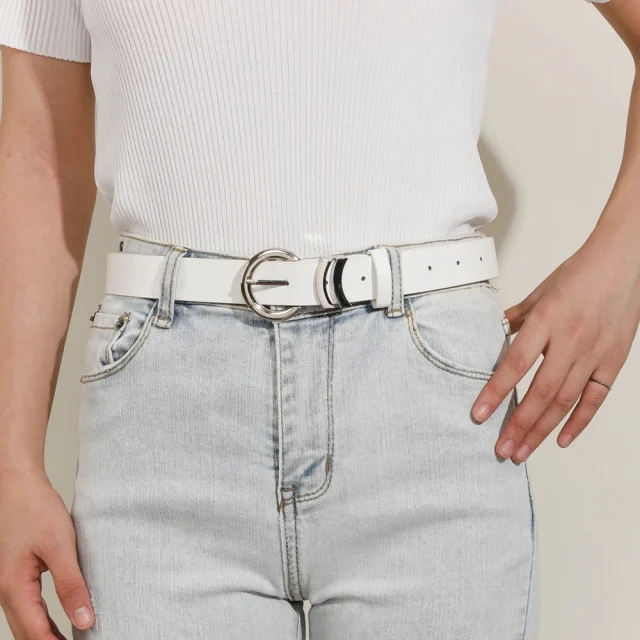 Turn simple outfits into fashion statements with the Women’s Double Crescent Buckle Belt. Designed with a sleek monochrome finish and a standout double crescent round buckle, this belt adds a bold touch of sophistication to any ensemble. Whether you’re pairing it with high-waisted jeans, skirts, or tailored pants, it effortlessly accentuates your waist and completes your look with modern elegance.