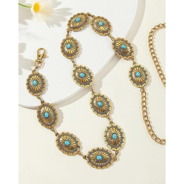 Turn every outfit into a showstopper with the Gold Western Bull Head Chain Belt. This dazzling metallic waist accessory blends bohemian charm with Western edge, creating a piece that’s both modern and timeless. Whether you’re styling up your favorite dress, adding a touch of glam to jeans, or completing a festival look, this belt effortlessly elevates your style with confidence and flair.