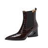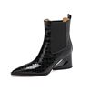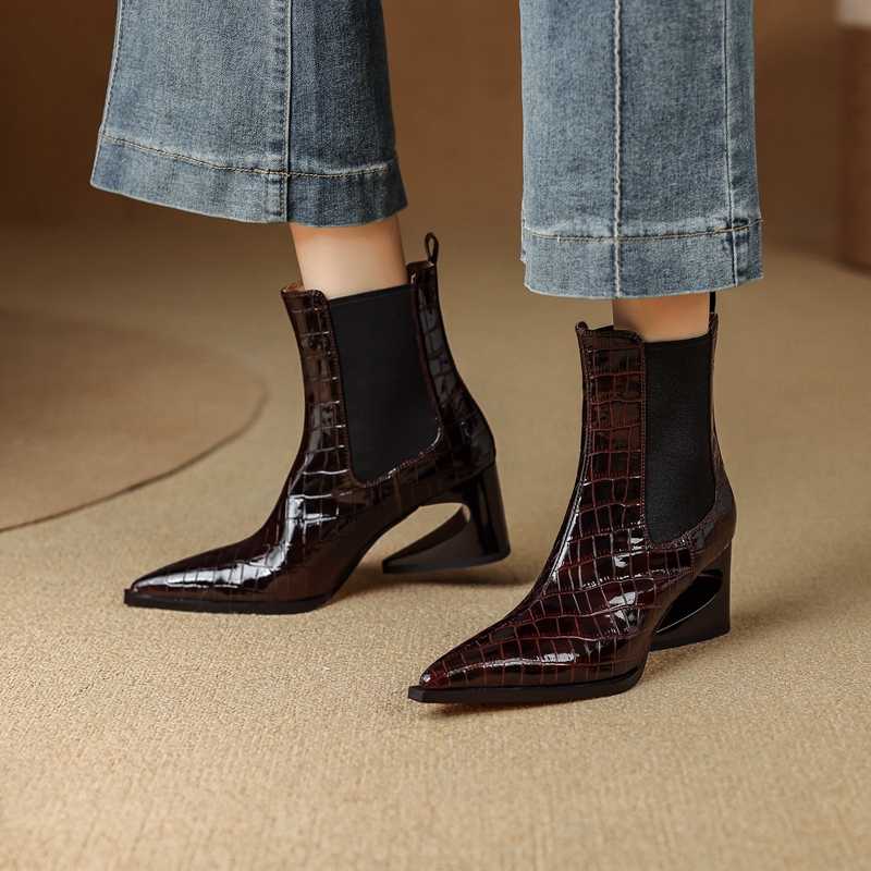 Elevate your wardrobe with these stunning women’s leather pointed high heel Chelsea boots. Designed to combine retro charm with contemporary flair, these mid-calf boots are perfect for women who want to make a bold fashion statement without compromising on comfort. Crafted from genuine leather and featuring a distinctive embossed pattern, these boots are versatile enough for both day and evening wear.