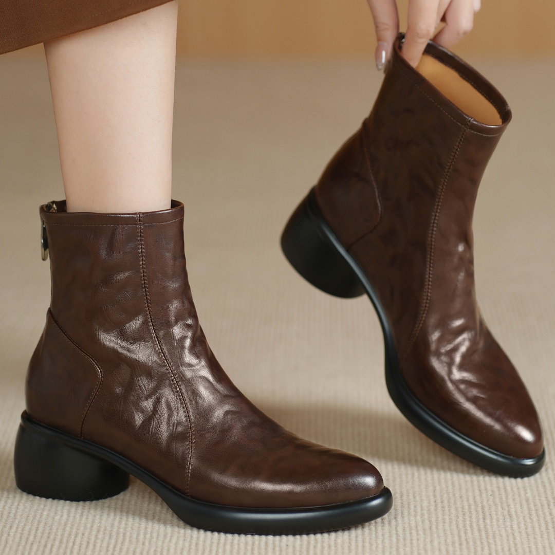 The round toe and soft structure offer a relaxed fit, while the 5cm (approx. 2 inches) round medium heel gives you just the right amount of lift for confident strides without sacrificing comfort. A stylish pleated finish adds a touch of texture, and the back zipper ensures an easy, slip-on experience – no hassle, just chic functionality. Whether you’re heading to brunch, a casual office day, or an evening stroll, these ankle boots are your go-to choice for autumn.
