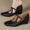 Women’s Sheepskin T-Strap Wedge Pumps – 2 Inch Heel Slip-On Comfort Shoes
