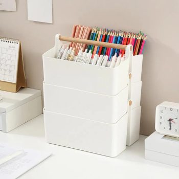 Adjustable Plastic Desktop Organizer Caddy with Wooden Handle