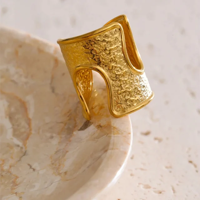 Crafted from durable stainless steel and finished with a rich 18K gold color PVD plating, this ring offers long-lasting shine and resistance to fading. It is free from high-concern chemicals and made to suit everyday wear. The size 7 fit is ideal for stacking or wearing alone as a statement piece. Whether you’re dressing for a casual coffee date, a workday outfit, or an evening event, this ring adapts effortlessly to your style.
