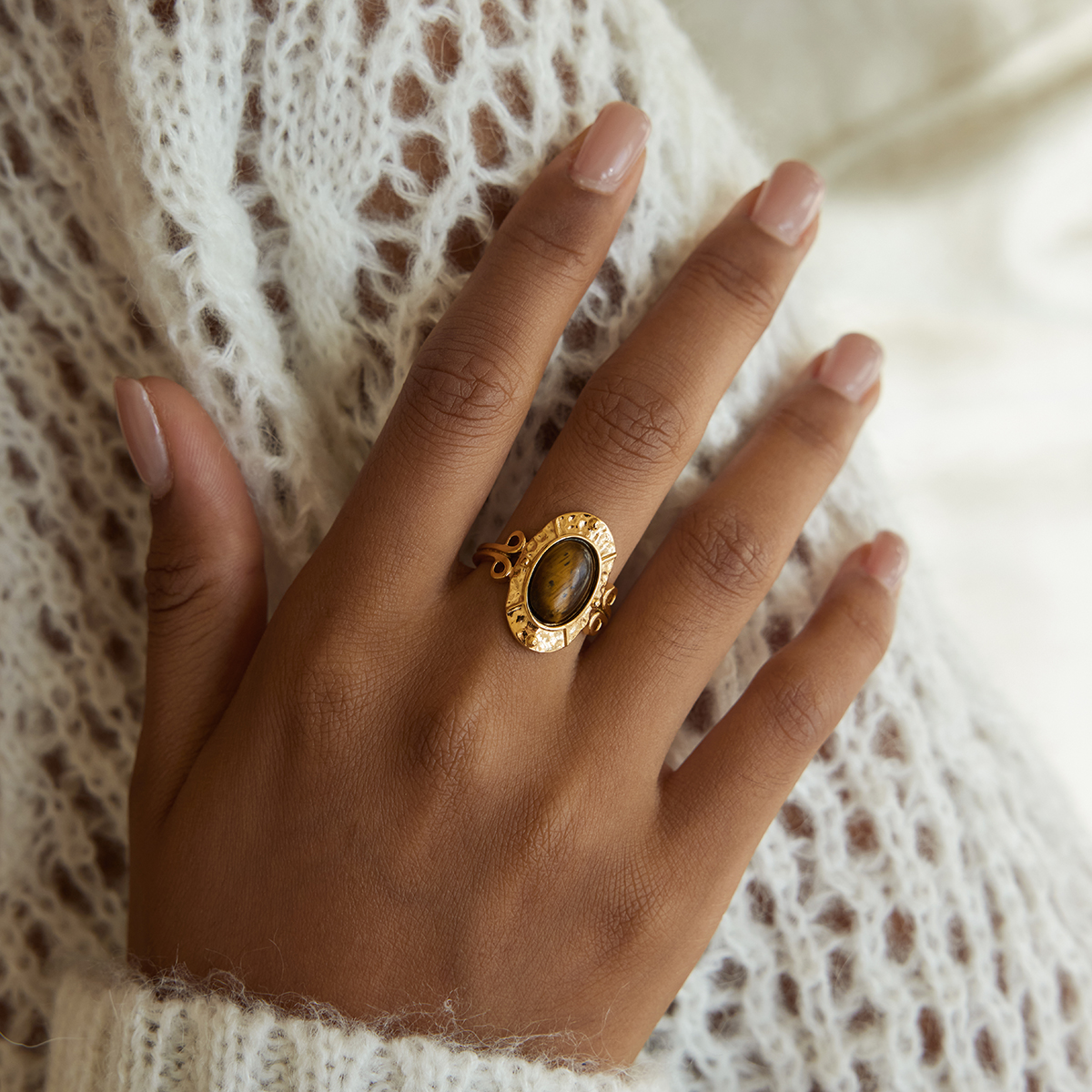 Add this Trendy Oval Tiger Eye Hammered Gold Ring to your collection and elevate your accessory game. Its unique design, luxurious finish, and versatile style make it a must-have piece for women who love chic, fashionable jewelry. Treat yourself or someone special today and enjoy a ring that is as timeless as it is trendy.