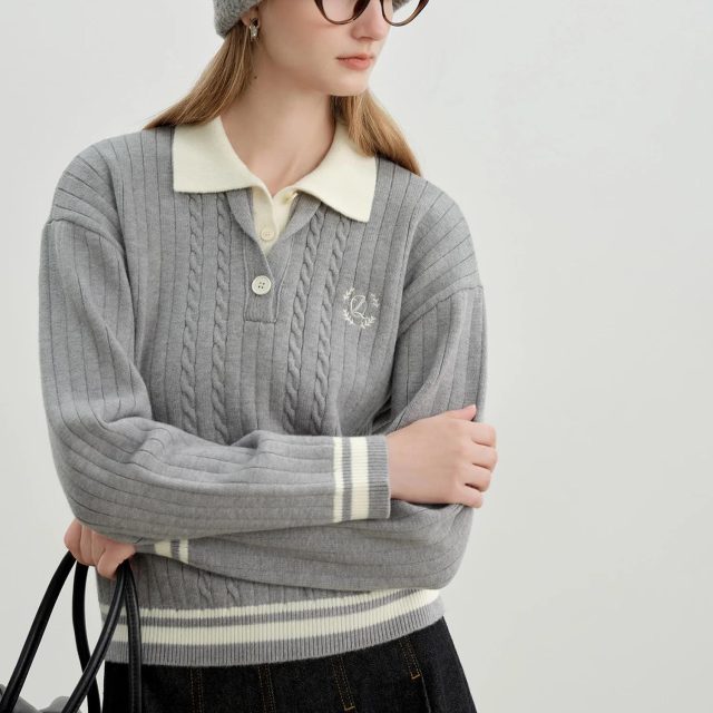 Step into the new season with a sweater that blends classic college style with modern comfort. This petite cable knit polo sweater is designed for women who love effortless fashion with a cozy touch. The soft knit texture, relaxed fit, and embroidered letter detail create a timeless piece that works for class days, office hours, or casual weekends.