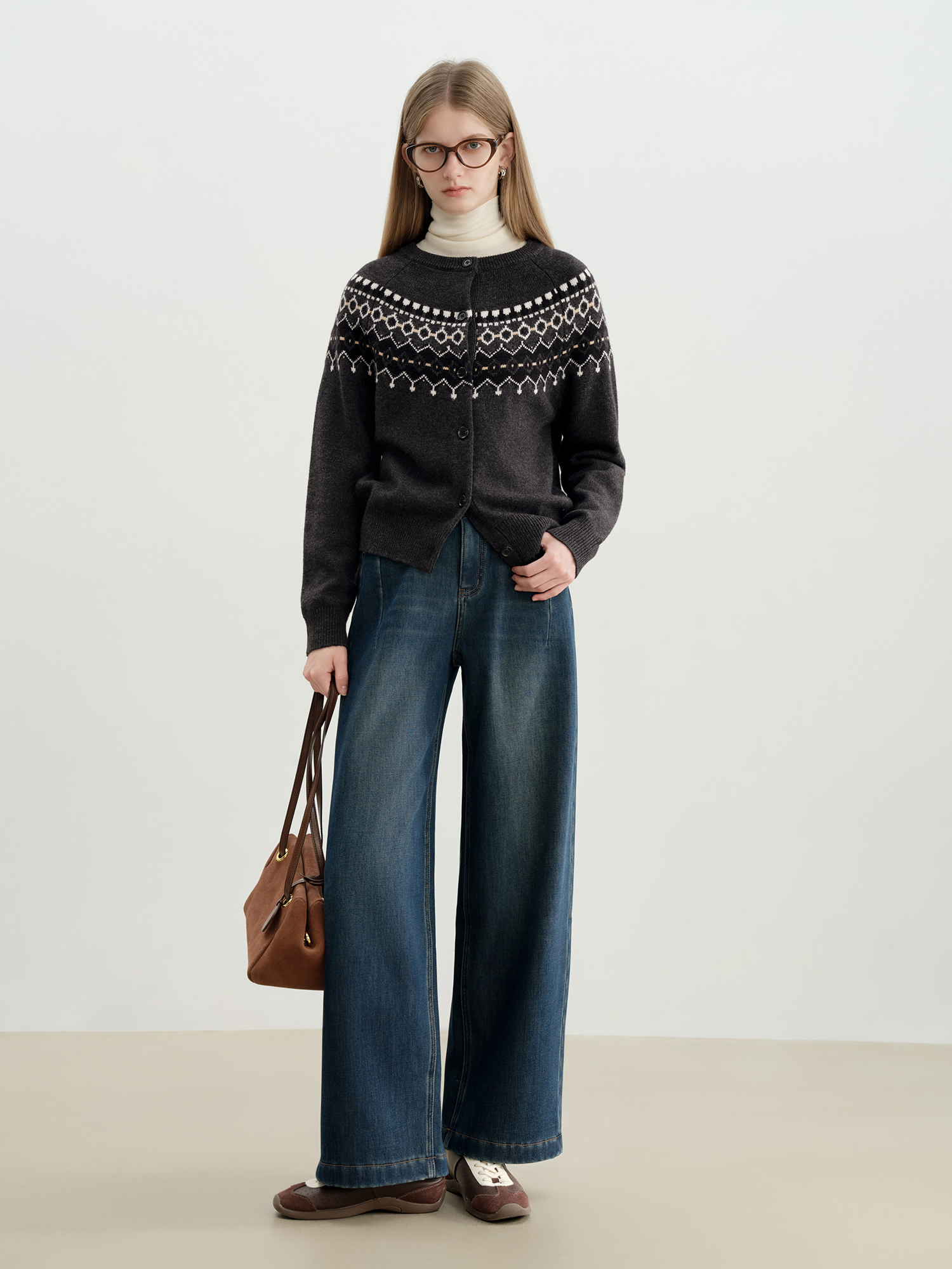 This cardigan stands out for its thoughtful fabric blend of nylon, sheep wool, and acrylic. The result is a soft, breathable knit with slight stretch that moves with you while keeping its shape. The Fair Isle argyle pattern gives it a truly vintage character, turning an everyday layer into a statement piece. Its full opening and single-breasted closure make it easy to style open or closed, depending on your mood.