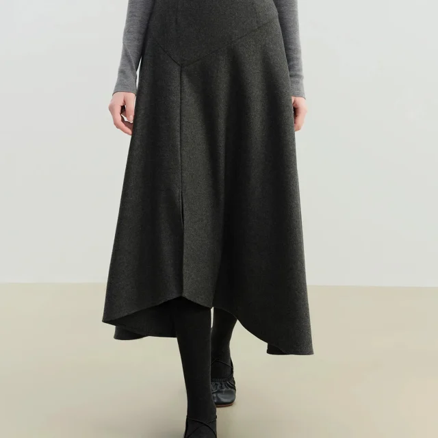 What truly sets this skirt apart is its asymmetrical design. While most midi skirts stay simple and predictable, this one adds visual interest with its angled seam and tasteful cutout. It brings character to your outfit without sacrificing professionalism. The wool-blend fabric keeps you warm during colder months, while the slight stretch ensures you stay comfortable throughout the day.