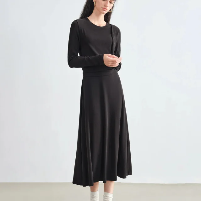 This chic black faux two-piece dress is designed to make you look polished without extra effort. The layered look gives the illusion of a styled outfit while keeping the comfort of a single dress. With its clean round neckline, long sleeves, and flattering A-line shape, it creates a soft, feminine silhouette that works for everyday wear or special occasions.