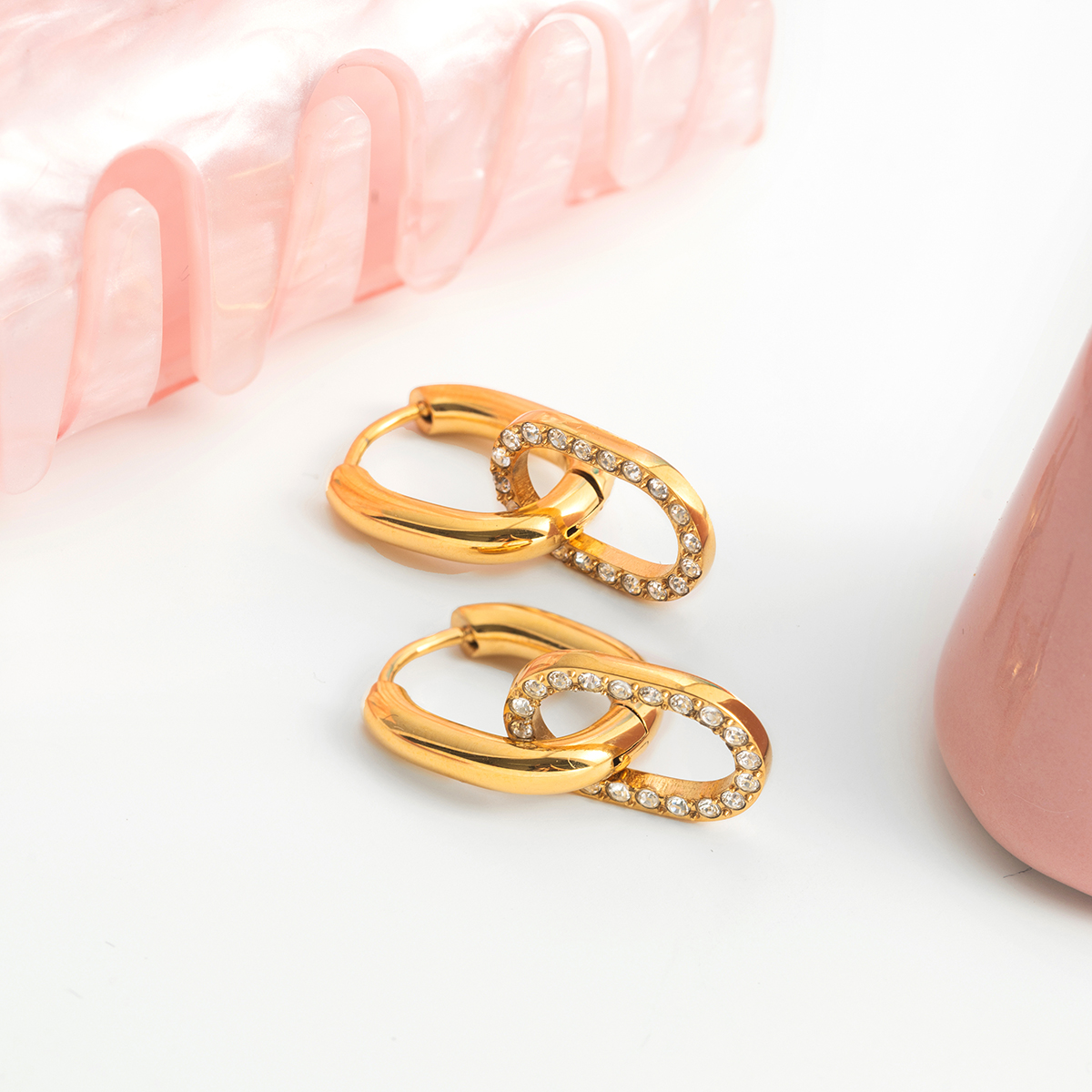 Trendy Double Circle Earrings with White Zircon – 18K Gold-Plated Stainless Steel