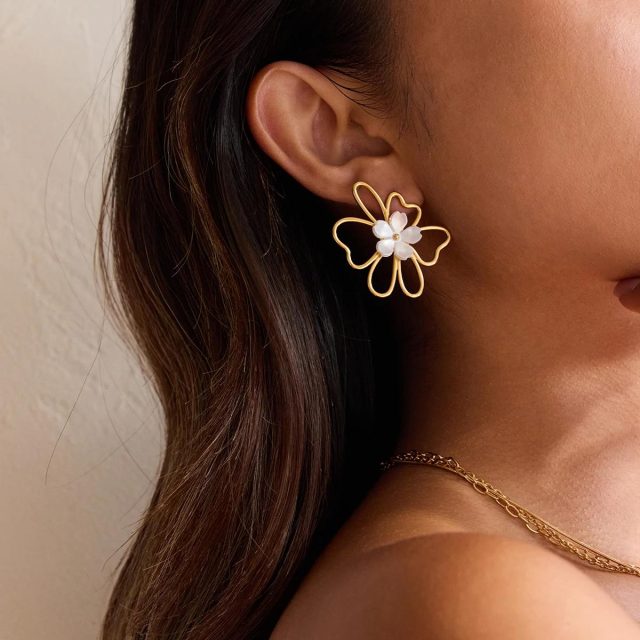 What makes these earrings special is their blend of modern trends with classic elegance. The flower shape with pearl accents creates a chic yet timeless design that flatters all styles and ages. They are perfect for elevating your look when you want to feel polished and radiant without overdoing it. Whether you’re gifting someone special or treating yourself, these earrings are a versatile addition to any jewelry collection.