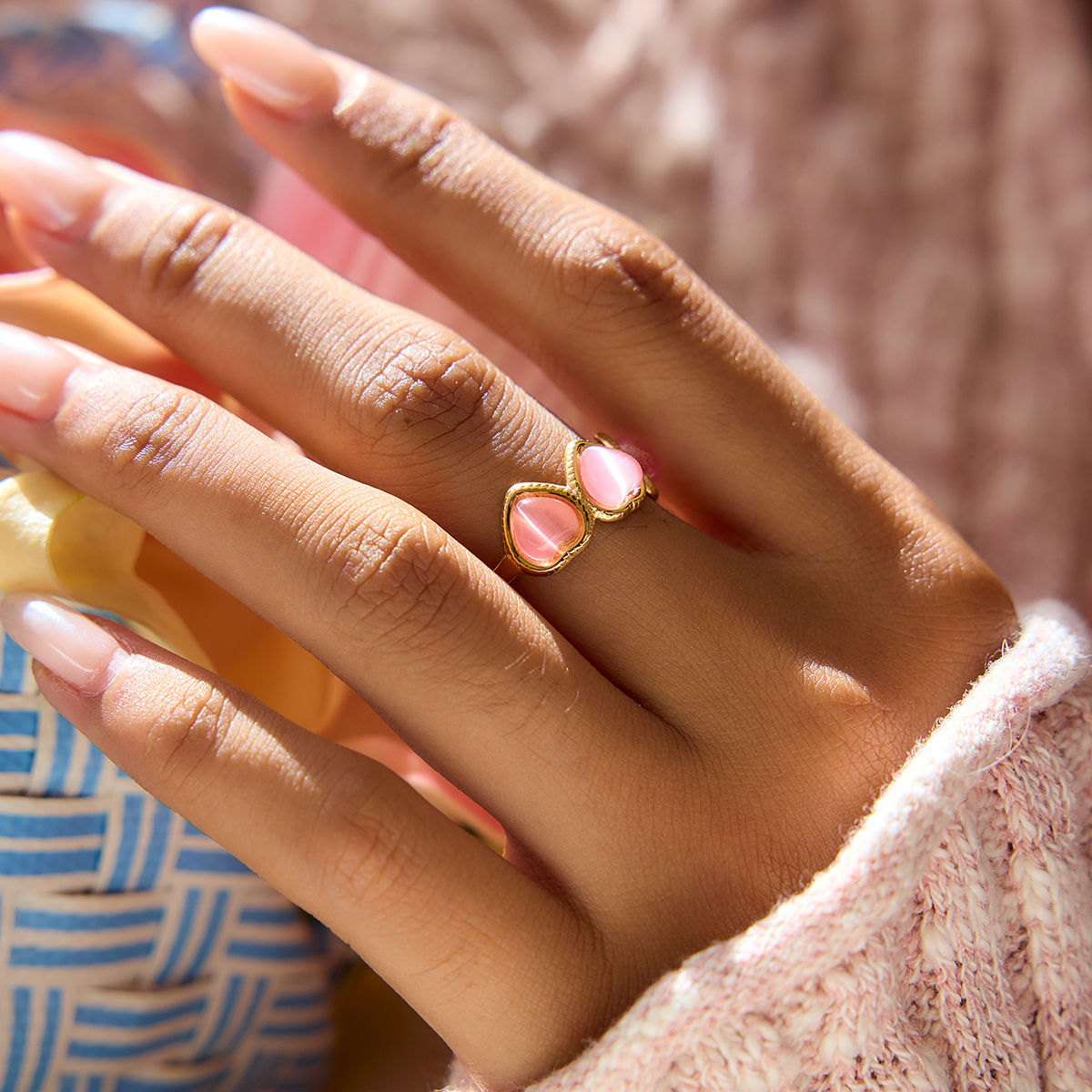 Fall in love with the soft charm of this Sweet Pink Heart Cat’s Eye Stone Ring, crafted to bring a touch of romance to your everyday style. Designed with a smooth heart-shaped cat’s eye stone in a dreamy pink hue, it radiates warmth, femininity, and a gentle glow that captures attention instantly. With its adjustable opening band and sleek 18K gold plated stainless steel base, this ring blends comfort, beauty, and durability into one irresistible accessory.